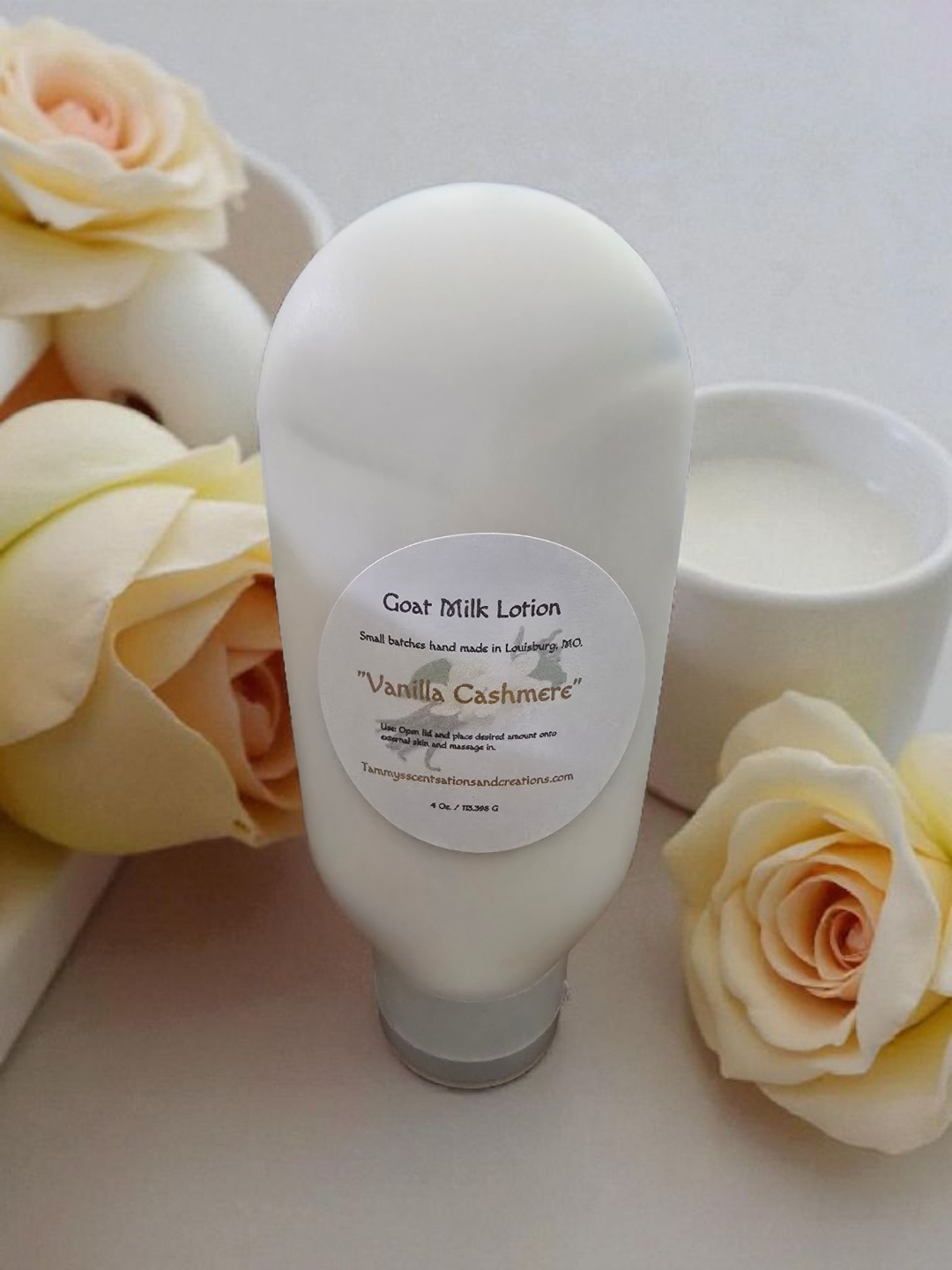 Indulge in pure luxury with our 4 oz. Vanilla Cashmere goat milk lotion—a sensory escape wrapped in elegance. This creamy blend opens with the sweetness of spun sugar and pink pepper, brightened by crisp red apple. The heart reveals a sophisticated mix of cashmere wood, jasmine, and lily, while a dreamy base of vanilla, benzoin, sandalwood, and smoky agarwood envelops your skin in cozy warmth. Pamper yourself with a fragrance that's as comforting as it is captivating.